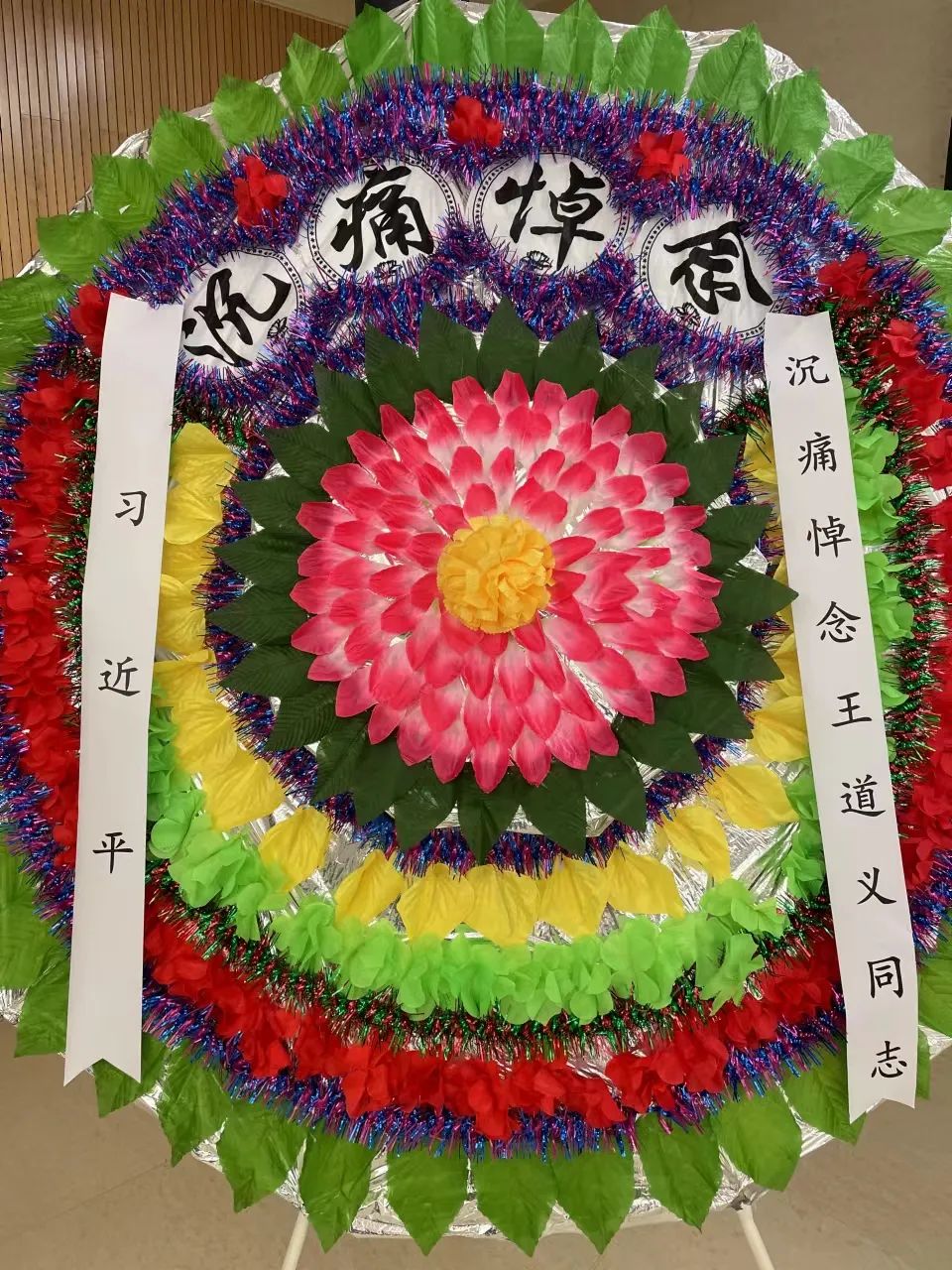 王道义同志逝世后,习近平同志送花圈,上书“沉痛悼念王道义同志”。